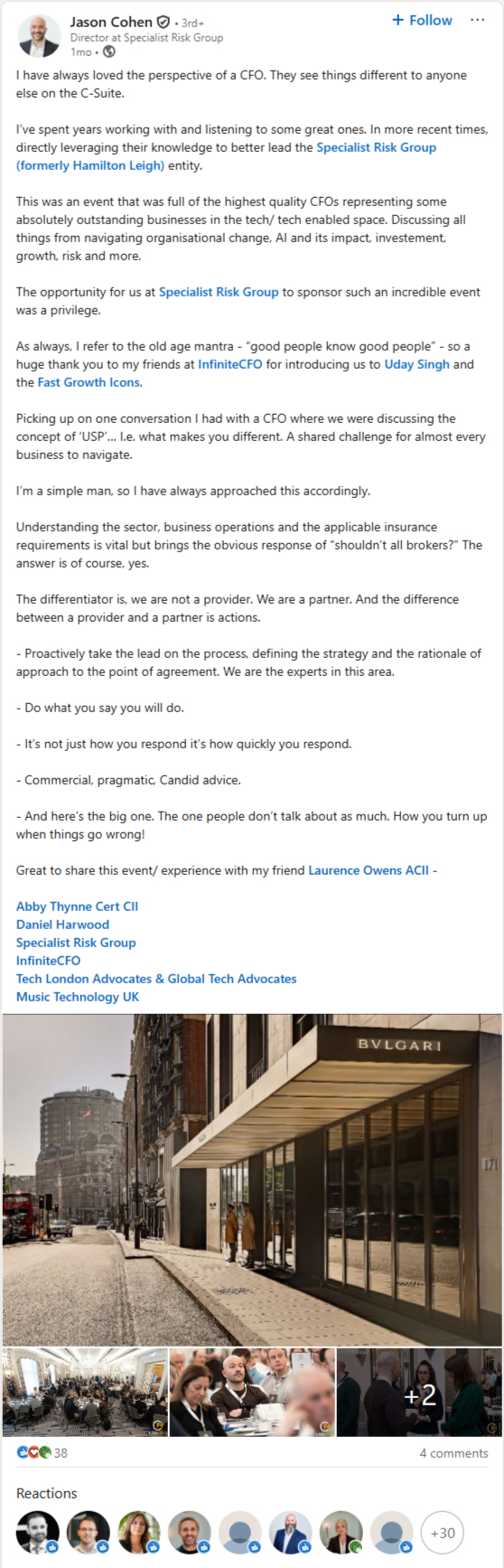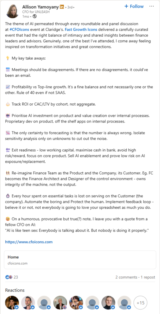 To help the CFOs behind the UK’s most ambitious Tech Companies create and manage rapid growth and scale, accelerate their company’s next big financial event, and support their role as a strategic value-add to the business.